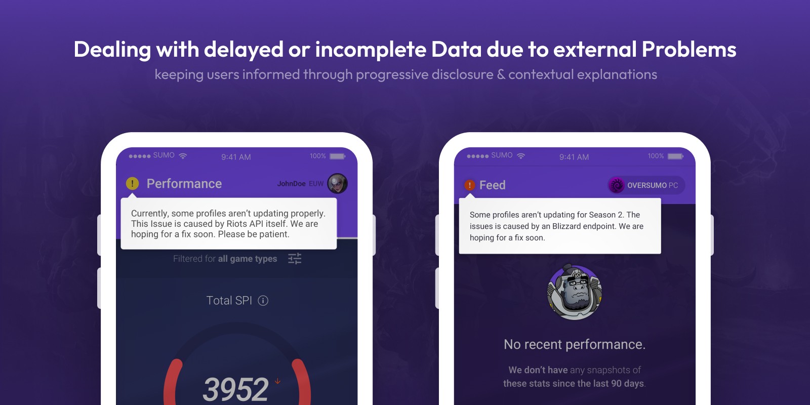 Due to the functionality on API-supported SUMO verticals, players expected real-time feedback and detailed coaching in each app. But in some cases we only had delayed or incomplete data to work with due to dependencies on external data sources. This mismatch threatened product experience, user trust and engagement.